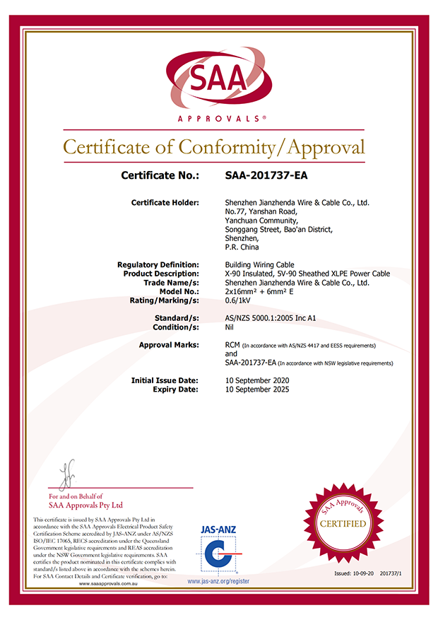 深圳建圳達電線電纜有限公司,成立于2000年,是一家電線電纜制造商,我們通過了世界各地不同市場的多數(shù)認證,如:CCC、RoHS、CB、SAA、TUV、VDE、PSE、BPS、UL、CSA。我們根據(jù)定制產(chǎn)品不斷更新新的認證。經(jīng)過數(shù)十年的發(fā)展,我們與來自世界各地的客戶建立了長期的合作關(guān)系。我們曾經(jīng)是菲律賓機場,,柬埔寨的電力站,美國的醫(yī)院,工廠,埃塞俄比亞的水電站項目。我們是一家值得信賴的電線供應(yīng)商。
